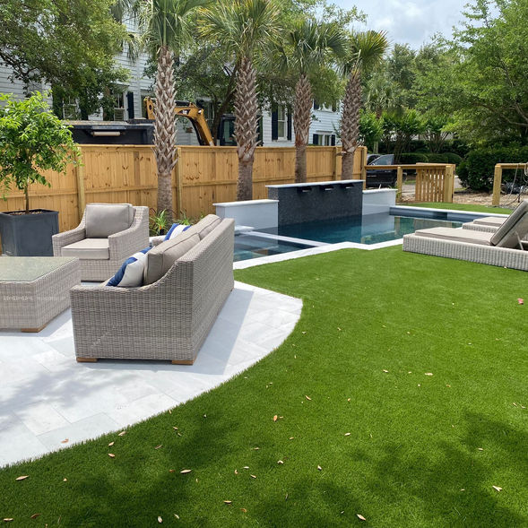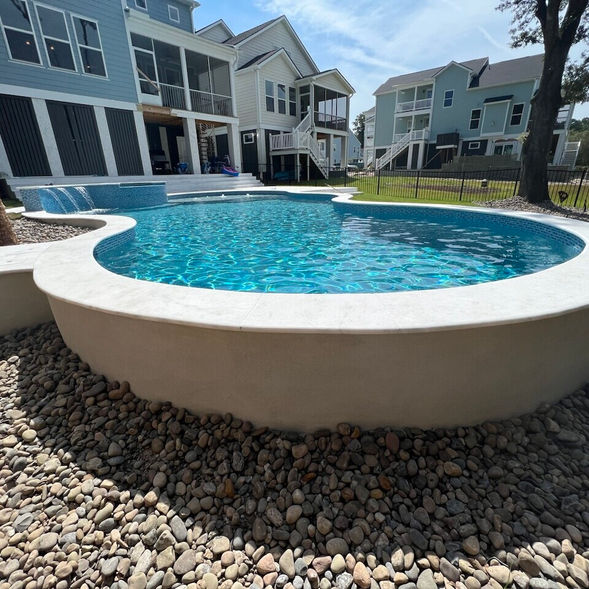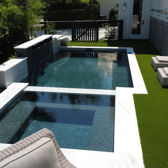 A modern pool featuring a water fountain and a large sun ledge, designed as a complete space for ultimate enjoyment and relaxation.